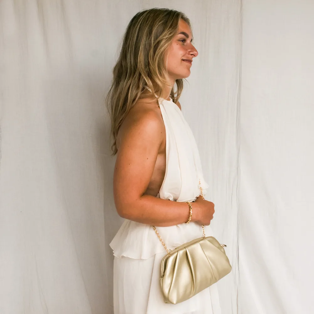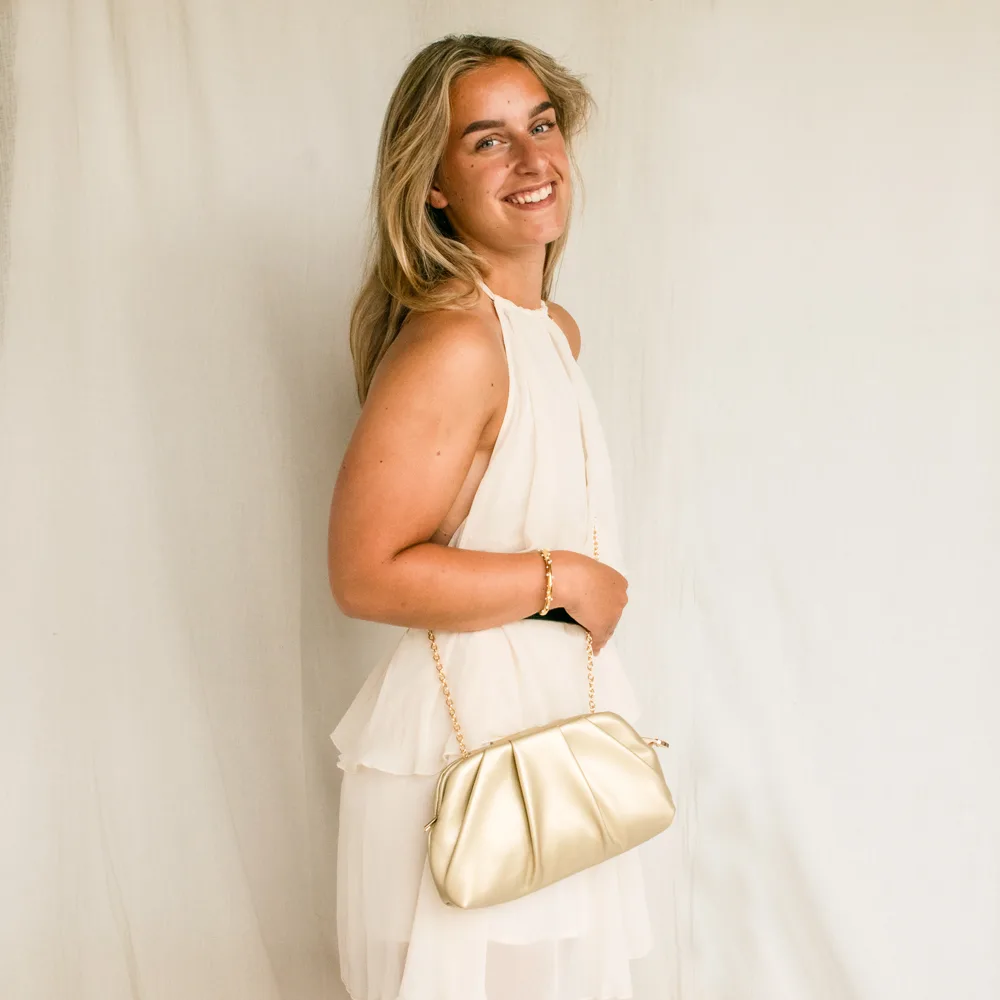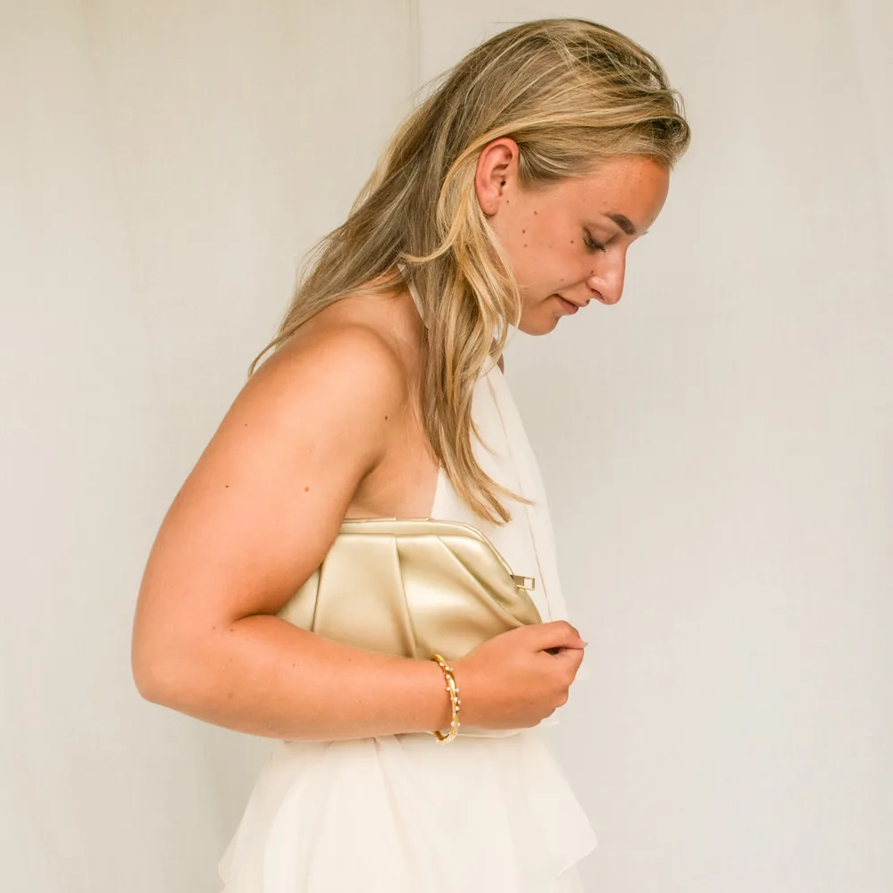 Voeg een vleugje verfijning en stijl toe aan je outfit met deze avondtas van vegan leer. Het geplooide ontwerp geeft de tas een unieke, chique uitstraling, perfect voor elke speciale gelegenheid. Of je nu naar een gala, bruiloft of een andere formele bijeenkomst gaat, deze clutch is het ideale accessoire om je look compleet te maken.