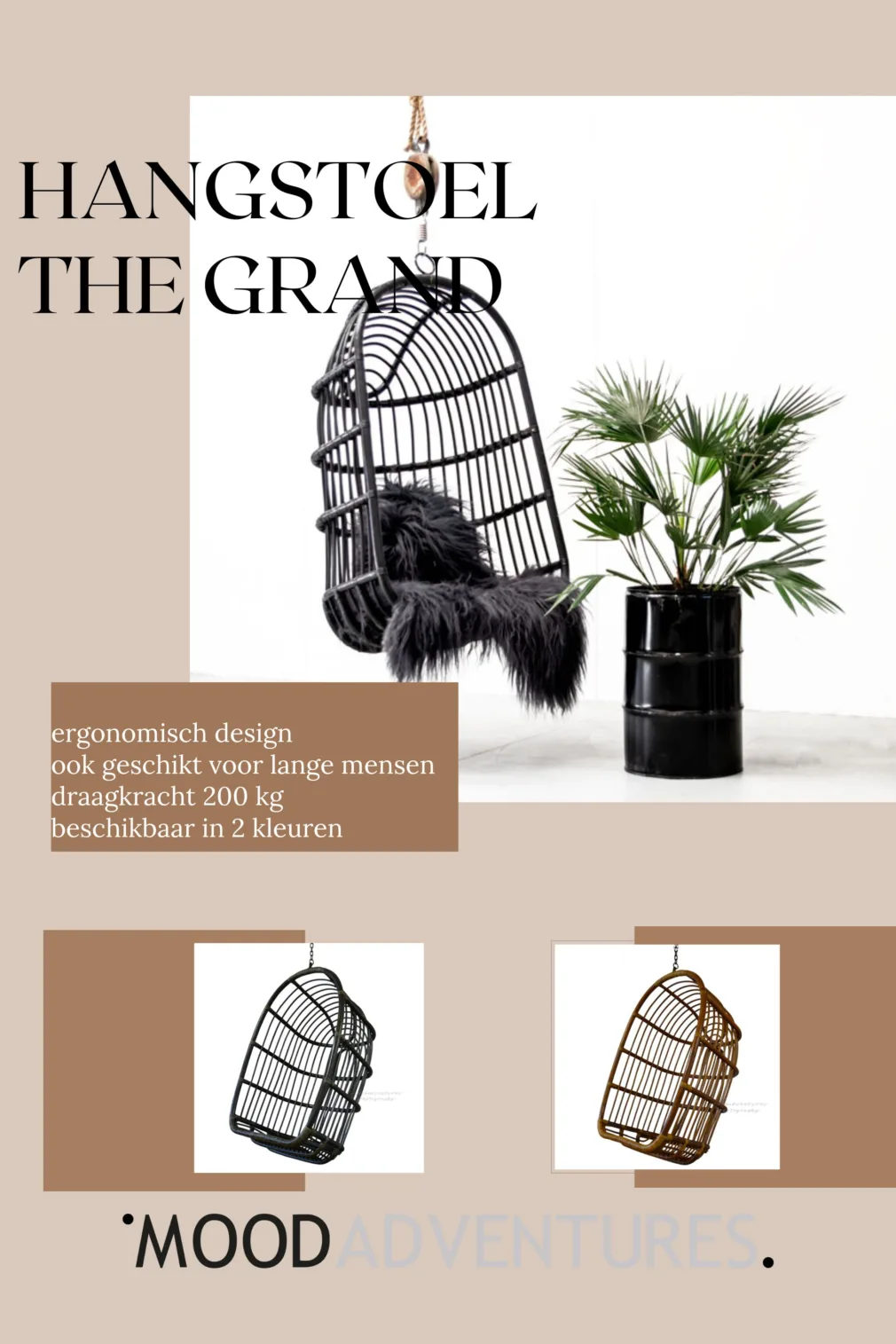 Ontdek ultiem comfort en ontspanning met onze hangstoel “The Grand”. Speciaal ontworpen voor lange mensen, biedt deze ruime hangstoel een ergonomisch zitcomfort dat je omhult in een gezellige cocon van rust. Met een indrukwekkende draagkracht van 200 kilo is deze stoel niet alleen stijlvol, maar ook een aanwinst in je woonkamer, slaapkamer of kinderkamer.