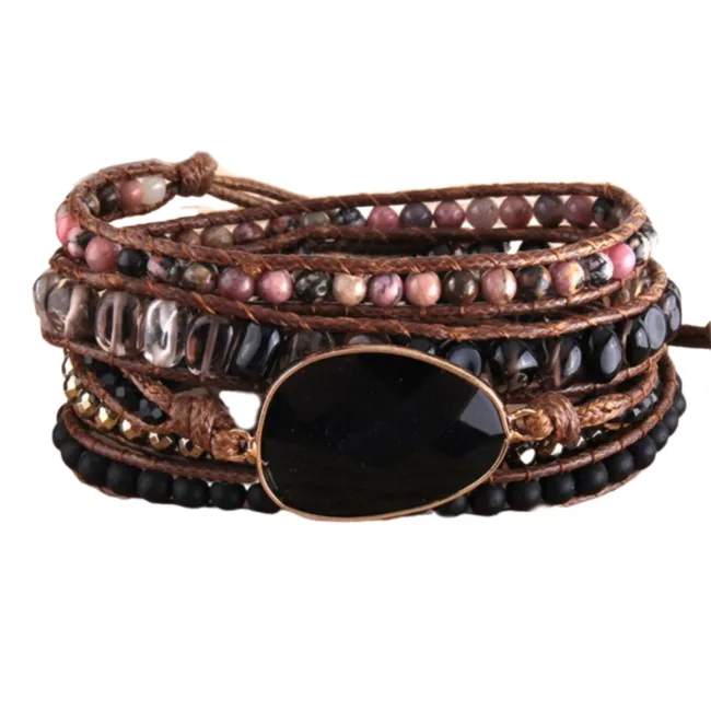 Wikkel Armband Edelsteen Zwarte Agaat Bruin Waxcord